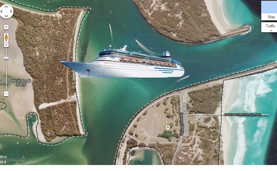 Apparently, until those boats learn to reverse the project’s dead in the water. Doesn’t stop people (read: morons) getting all excited about it. The mayor’s old mate Newman (who runs the state of Queensland in a state of disarray) is a public supporter of a cruise ship terminal, so long as someone else is paying for it. Australian politicians like to pretend we’re always flat broke. I can’t say I mind because the alternative is living like Greece, who were flat broke but spent money like a sailor on shore leave (until the money ran out). It also happens that maintaining this siege mentality is the only thing that stops the pollies from buying us a cruise ship terminal. With Newman already sacking 15,000 people to prevent us from plunging over the fiscal cliff it’ll be a while before he has the gall to buy a terminal for big boats. As in, the second term of his government.